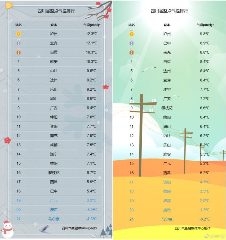 其实不然!气象实况观测显示,19日8时,全省平均气温零下2.7℃,与昨天8时相比,南充、遂宁、巴中、广元、甘孜5个市州气温低于昨天,攀西地区的凉山州、攀枝花市气温基本持平,其余14市州的气温有上升。