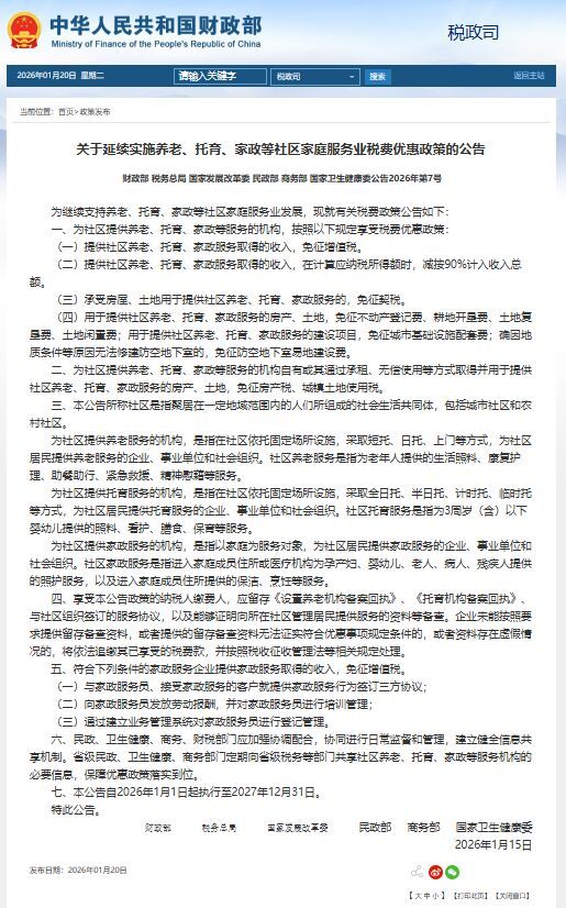 关于延续实施养老、托育、家政等社区家庭服务业税费优惠政策的公告