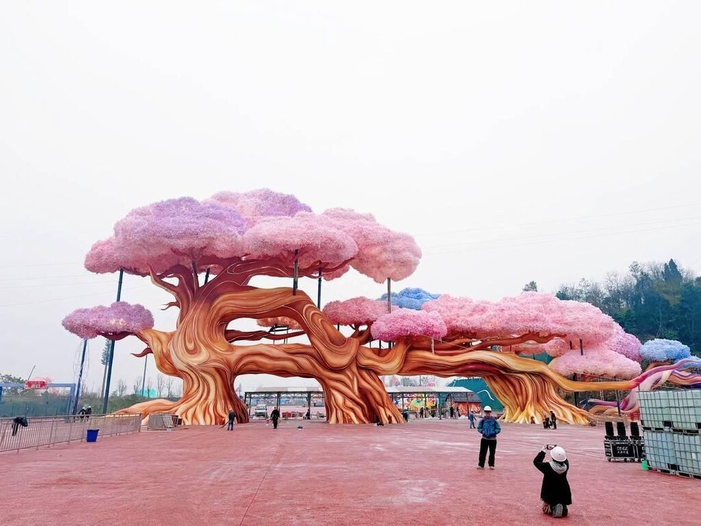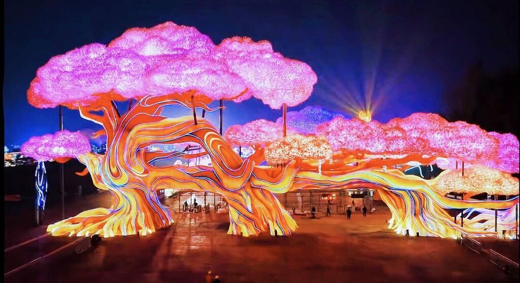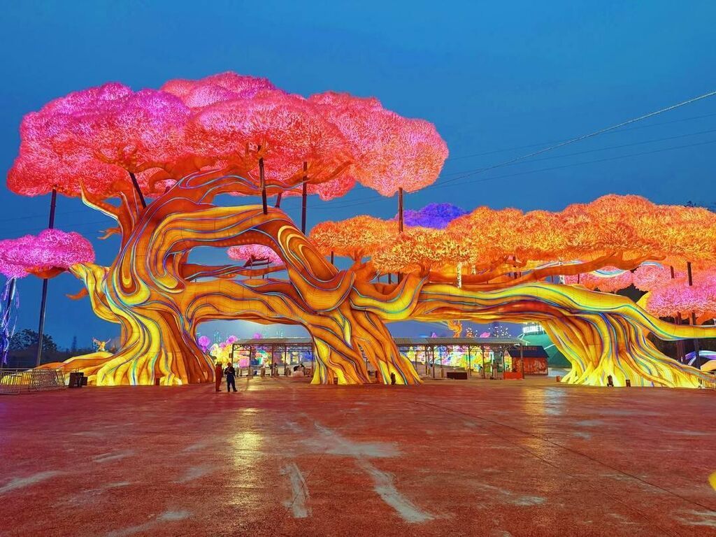 这座高27米、长130米的巨型“梦幻灯树”,是通过原画师与AI共同完成的设计工作,还有近百名观众和网友参与到设计当中,是名副其实的“定制彩灯”。同时,也首次应用了定制透光布、400吨大吊车以及大规模使用非遗竹编工艺。