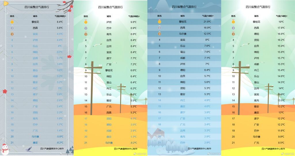 图为四川省各城市1月21日8时、1月18日8时、1月20日14时、1月18日14时实况气温。