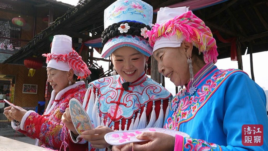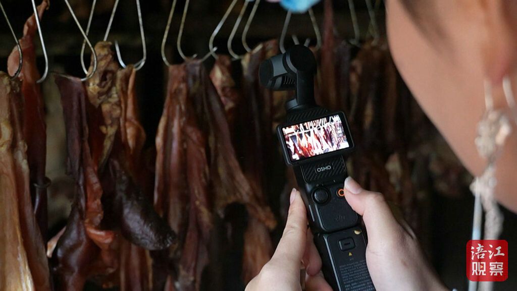 00后羌族姑娘陈新一站在镜子前换上艳丽的羌服,随后提着摄像设备走进村里一户羌家的腊肉炕房。灶台上,悬挂着一排排色泽红润的腊肉,阳光透过窗棂洒在腊肉上,透出诱人的光泽。她举起相机,一边调整角度,一边与正在熏肉的婆婆聊天。