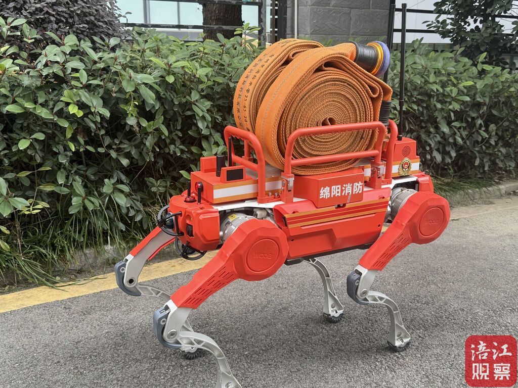 一身亮橙色的“消防服”,搭配金属质感的机械腿,跑起来自带“哒哒哒”的节奏感,像极了刚领到新装备就急着出任务的热血少年。背上两卷粗壮的消防水带,活像背着巨型“能量面包”,两根天线高高竖起,宛如一对傲娇的小耳朵,时刻接收指挥中心的信号,身体两侧印有的“科新消防”“绵阳消防”几个大字格外显眼。