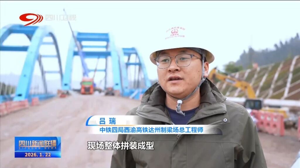 中铁四局西渝高铁达州制梁场总工程师 吕瑞:大桥首先在厂内分节段制造,现场整体拼装成型,然后采用智能的顶推设备和控制系统进行顶推施工,使1531吨的桥梁在不中断高速公路通行的情况下,精确地移动到设计桥位。