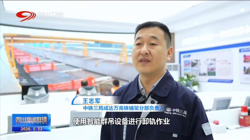 中铁三局成达万高铁铺架分部负责人 王志军:我们在长轨装卸中使用智能群吊设备进行卸轨作业,实现可视化管理和故障报警连锁控制。32台群吊同步起升、横移与定位,确保500米长轨在吊运中始终保持直线状态,保障了轨体质量。