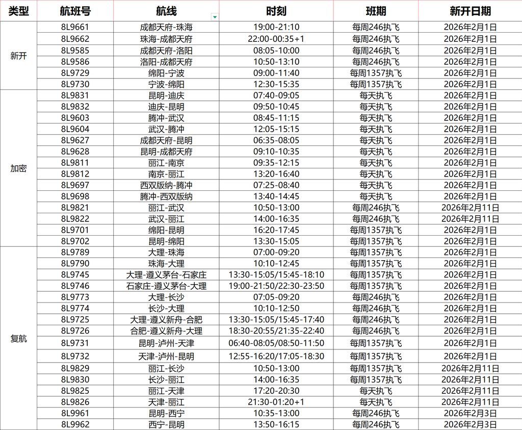 2026年春运大幕将开启,1月23日,记者从新海航旗下祥鹏航空获悉,2月1日起,祥鹏航空将开通成都天府直飞珠海、成都天府直飞洛阳的航线,每周二、四、六执飞;新开通绵阳直飞宁波航线则是每周一、三、五、七执飞。同时,对7条热门旅游航线进行运力升级,包括昆明至成都天府、昆明至迪庆、腾冲至武汉、丽江至南京等,航线每日执飞;昆明至绵阳航线将根据客流动态加密班次,每周一、三、五、七执飞,形成“节前返乡有保障、节后出游更从容”的弹性运力网络。复航航线精准匹配“返乡潮”与“旅游潮”双向需求,包括昆明经泸州至天津等特色线路,每周一、三、五、七执飞。