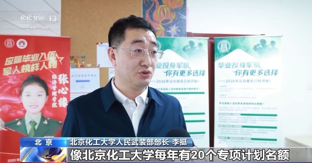 北京化工大学人民武装部部长 李挺:退役学生想考研的话,像北京化工大学每年有20个专项计划名额。对于应征入伍的在校学生来说,服役回来的学生,除了特定专业之外,可以回来在全校任选专业。对于毕业生来说,我们更建议征兵入伍是一个职业选择,把自己的职业生涯规划到部队。
