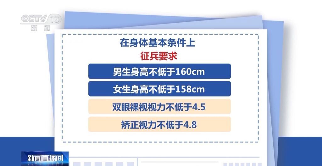 在身体基本条件上,征兵要求男生身高不低于160cm,女生不低于158cm,双眼裸视视力不低于4.5,矫正视力不低于4.8,具体标准可查询全国征兵网(http://www.gfbzb.gov.cn/)体格检查标准摘要。有意向参军入伍的大学生,需登录“全国征兵网”,如实填写相关信息报名应征。