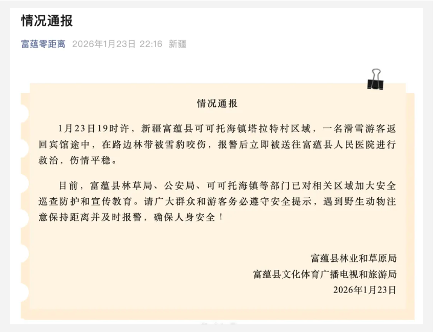 ·一滑雪游客被雪豹咬伤,新疆富蕴县通报。