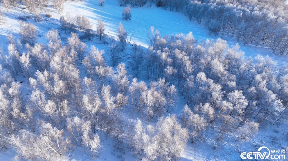 在内蒙古呼伦贝尔市,航拍极寒天气下的低山丘陵雪野山峦银装素裹。