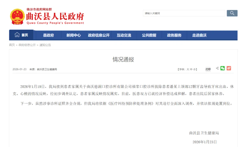 ·山西曲沃通报女子拔12颗牙后休克心梗:全面深入调查涉事诊所。