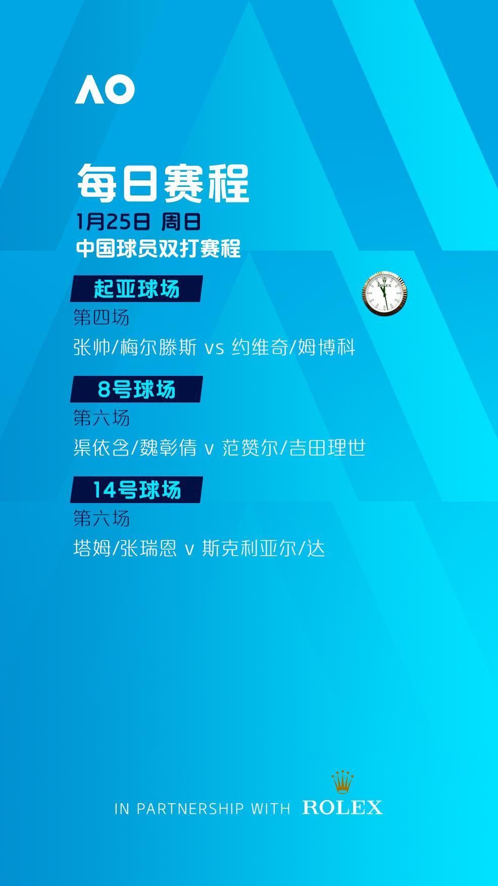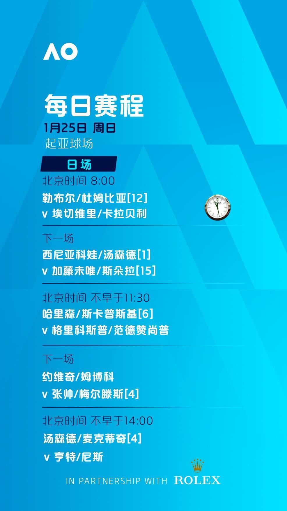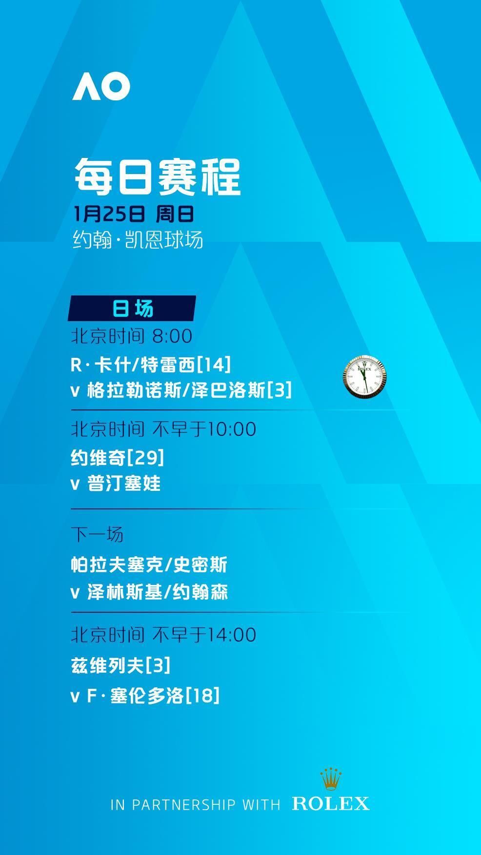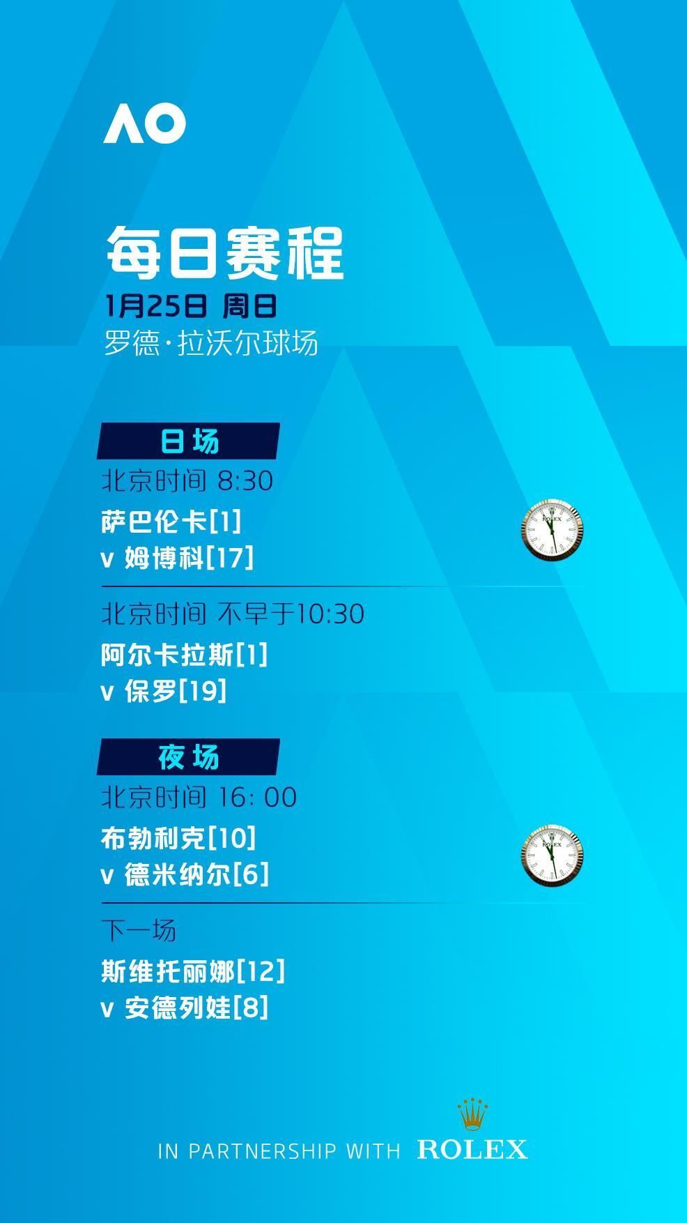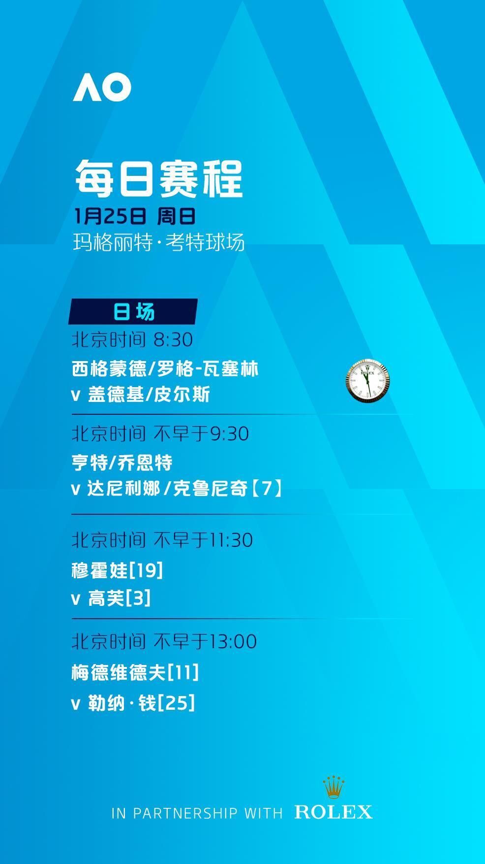 罗德·拉沃尔球场、玛格丽特·考特球场将从北京时间8:30开打,其余球场将分别从北京时间7:00和8:00开打。
