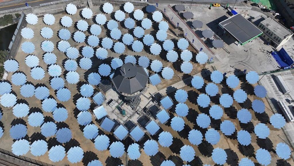 在攀枝花市西区,144个六边形定日镜,将阳光反射到聚光反应塔上,26面体钛酸锶将太阳光子转换为电子,在一段高倍聚光下拍摄的视频里,“光合作用”后的氧气像火焰般在玻璃背后冒出,氢气则被收集起来。根据实验室检测数据,其产出的氢气纯度可以达到99.8%、氧气纯度可以达到98.6%。