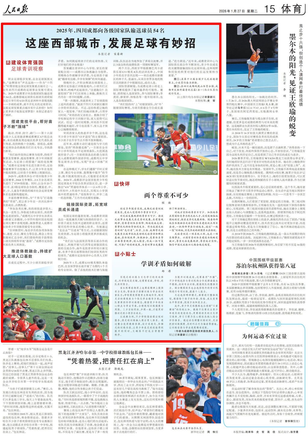职业足球稳步发展,业余足球氛围火热,“金牌球市”声名远扬……作为“十四五”时期首批全国足球发展重点城市之一,近年来四川成都的足球事业发展可谓火热。2025年成都累计向各级国家队输送球员54名,成都蓉城足球俱乐部球员胡荷韬在近日举行的U23男足亚洲杯中表现亮眼……丰硕的成果,离不开扎实的足球青训。这座足球发展重点城市有什么妙招?如何让更多孩子绽放足球梦想?本报记者进行了调研。