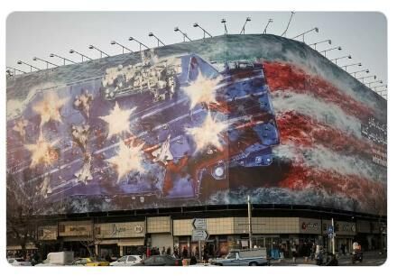据报道,在伊朗首都德黑兰市中心,伊朗竖起巨幅宣传画:一艘美军航母被炸,血水流入大海,配文“煽风者将得到风暴”,意指美方将自食其果。