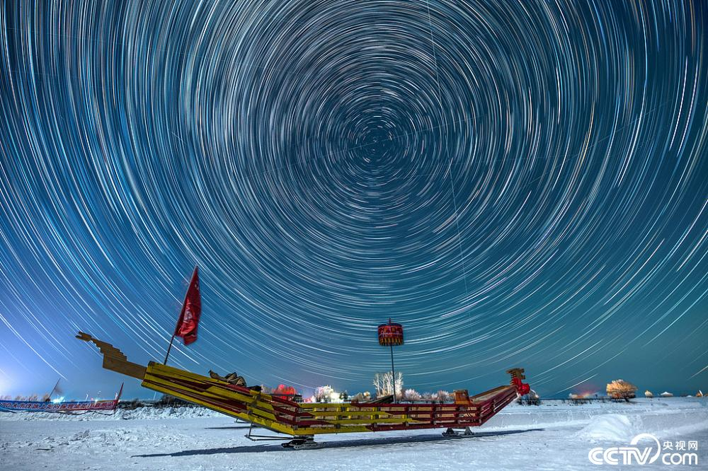1月25日腊七,黑龙江省伊春市嘉荫县,永安东湖是国家3A级旅游景区,夜幕降临,远处鄂伦春村落的灯火与冰雪龙舟上空的星星遥遥相望。