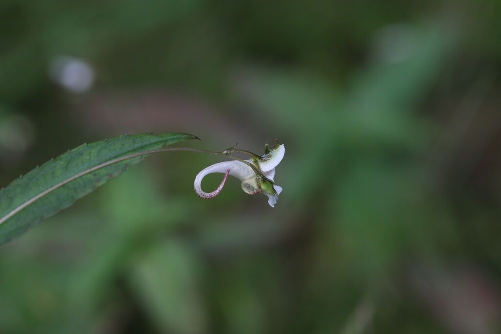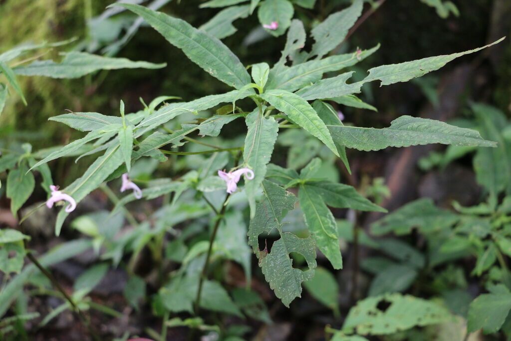 从照片上看,龙苍沟凤仙花在形态上与弯距凤仙花相似。它的叶片边缘具浅圆状锯齿、叶片背面常呈紫红色、花序通常具2朵花。与此同时,该新物种的花长1.2–1.8厘米,旗瓣直径6–8毫米,其侧生萼片等部分还具有系列特征,这些特点使它区别于其他物种。