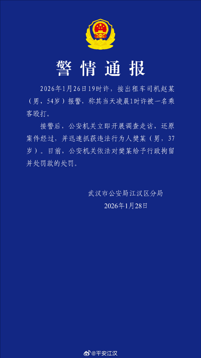 ·武汉警方通报“乘客殴打出租车司机”:行拘,并处罚款。