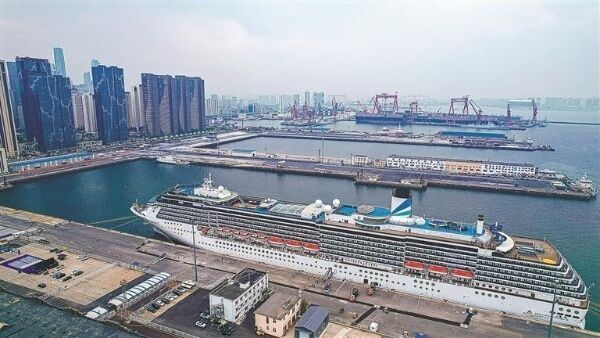 2025年5月27日,“爱达·地中海”号停靠在大连港国际邮轮中心泊位(无人机照片)。图/新华社