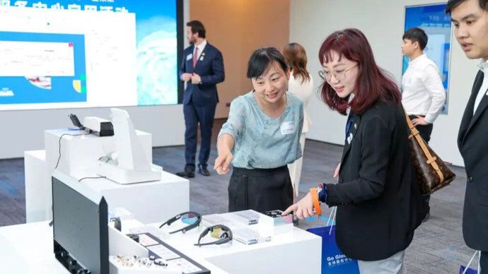2025年4月29日,来访者在位于深圳市南山区的全球服务中心企业产品展示区域参观。图/新华社