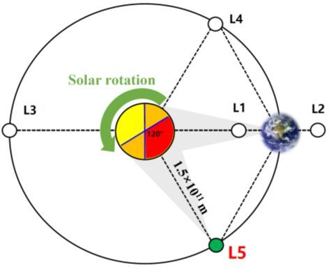 “羲和号”环绕地球运行,“羲和二号”则不是。“羲和号”科学与应用系统总设计师、南京大学天文与空间科学学院教授李川介绍,太阳和地球有5处引力平衡点,L1、L2、L3在日地连线上,L4、L5则在地球环绕太阳运行的轨道上,各自与太阳、地球构成边长约1.5亿公里的等边三角形,如果将地球公转方向视作“前方”,L5在地球的“身后”。
