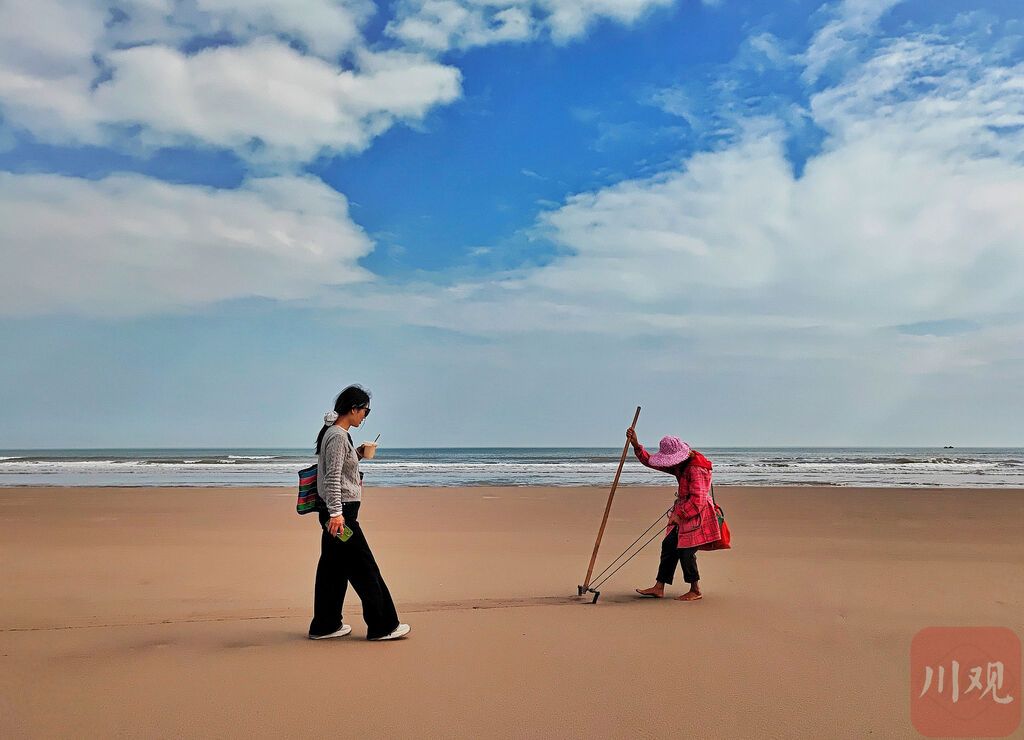浪花温柔地漫过我们脚下,一浪又一浪。沙滩上正有渔民赶海,海面上远远地漂着一艘老式渔船。