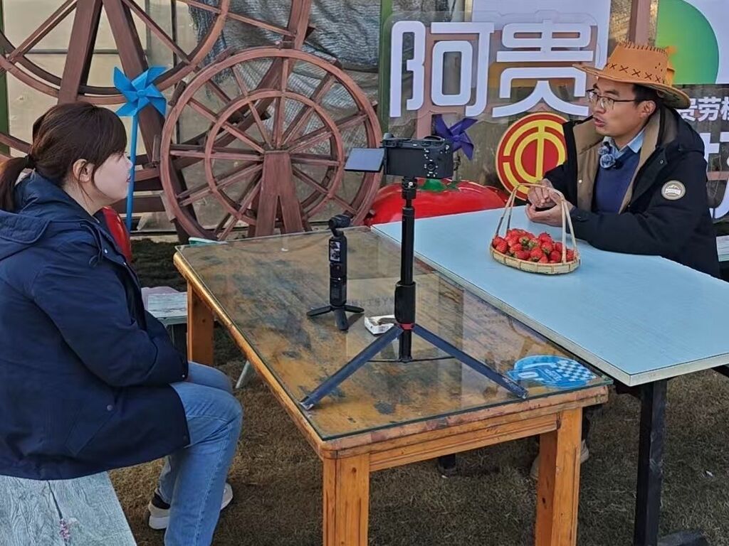 “这个品种就是巧克力草莓,大家在摘的时候捏到这个草莓最宽的地方,轻轻摇一下就脱了”,“这个是大球盖菇,它是用桑枝条、稻壳和玉米芯种出来的,吃起来脆滑爽口,我们拿回去煎、炒、炖、炸都可以。”阿贵热情地招呼着每一位前来采摘的游客。