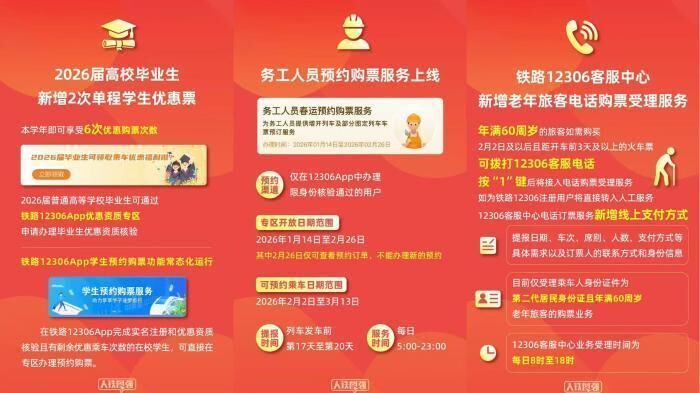 为2026届高校毕业生异地求职增加2次优惠购票次数,继续为学生、务工人员提供预约购票服务。
