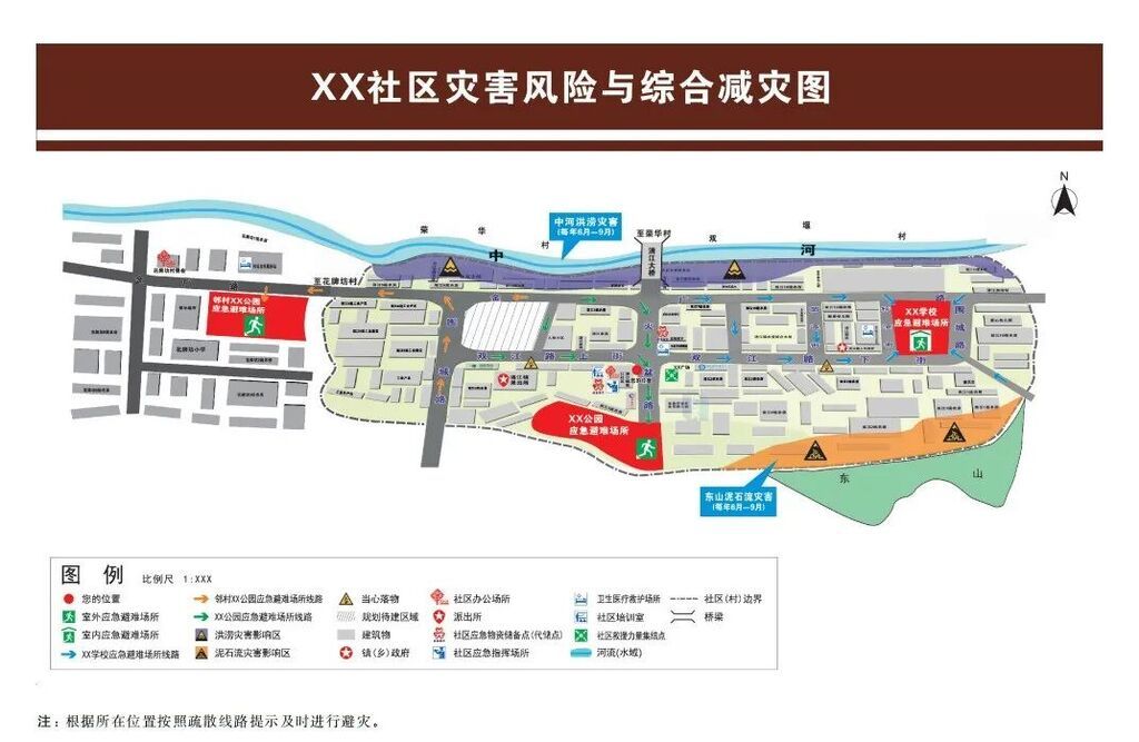 社区灾害风险与综合减灾图:综合展示社区内灾害风险种类及隐患点位置或区域、社区综合减灾场所位置、疏散线路等信息;