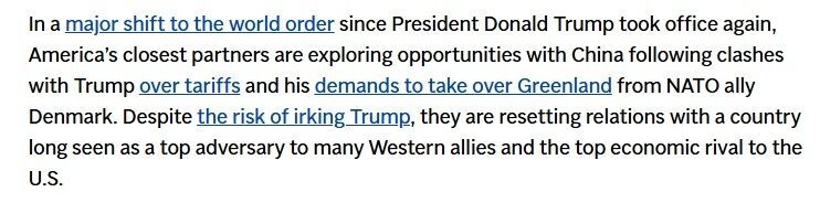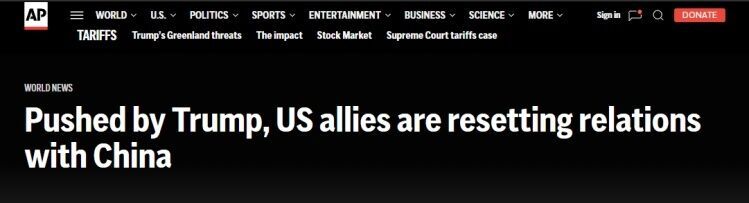 文章说,近期,美国的西方盟友们正在寻求与世界第二大经济体建立更密切的关系。加拿大总理卡尼访华,大幅削减对中国电动汽车等关税。英国首相斯塔默访华修复了两国近年来的紧张关系,还有法国总统马克龙、爱尔兰总理马丁、韩国总统李在明、芬兰总理奥尔波也在过去几周访问了中国。
