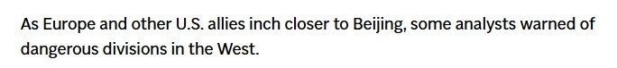 文章最后说,随着欧洲和其他美国盟友与中国越走越近,一些分析人士认为西方可能出现危险的分裂。