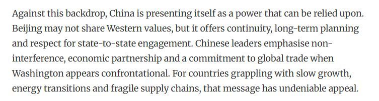 文章认为,在此背景下,中国是可靠力量。中国提供了连续性、长期规划和尊重国家间的交流。中国强调不干涉、经济伙伴关系和对维护全球贸易。对于那些正面临增长缓慢、能源转型和供应链脆弱的国家来说,这一主张具有不可否认的吸引力。另外,中国与美国不同,中国并不要求合作时必须实现意识形态上的一致性。中国提供市场、投资和交流。在不确定的时代,这些反而更体现了一种稳定。
