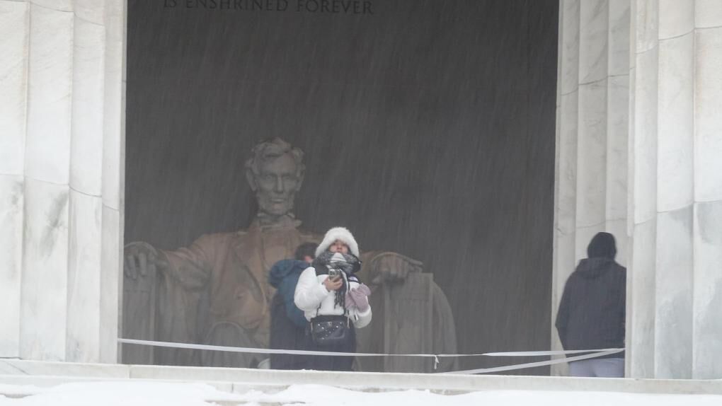 1月25日,人们冒雪参观美国首都华盛顿的林肯纪念堂。新华社记者徐剑梅摄