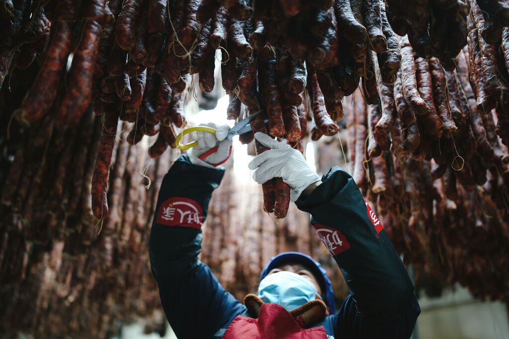 腊味,“寄”走了异乡人的“乡愁”,“寄”来了当地人的“机遇”。特别是每年冬天腊味生产的旺季,农场需要工人来处理食材、腌制、晾晒、包装,这些岗位让不少村民在家门口就能挣到钱。工人严大秀说:“家门口就可以就业,每月可以收入4000元。”