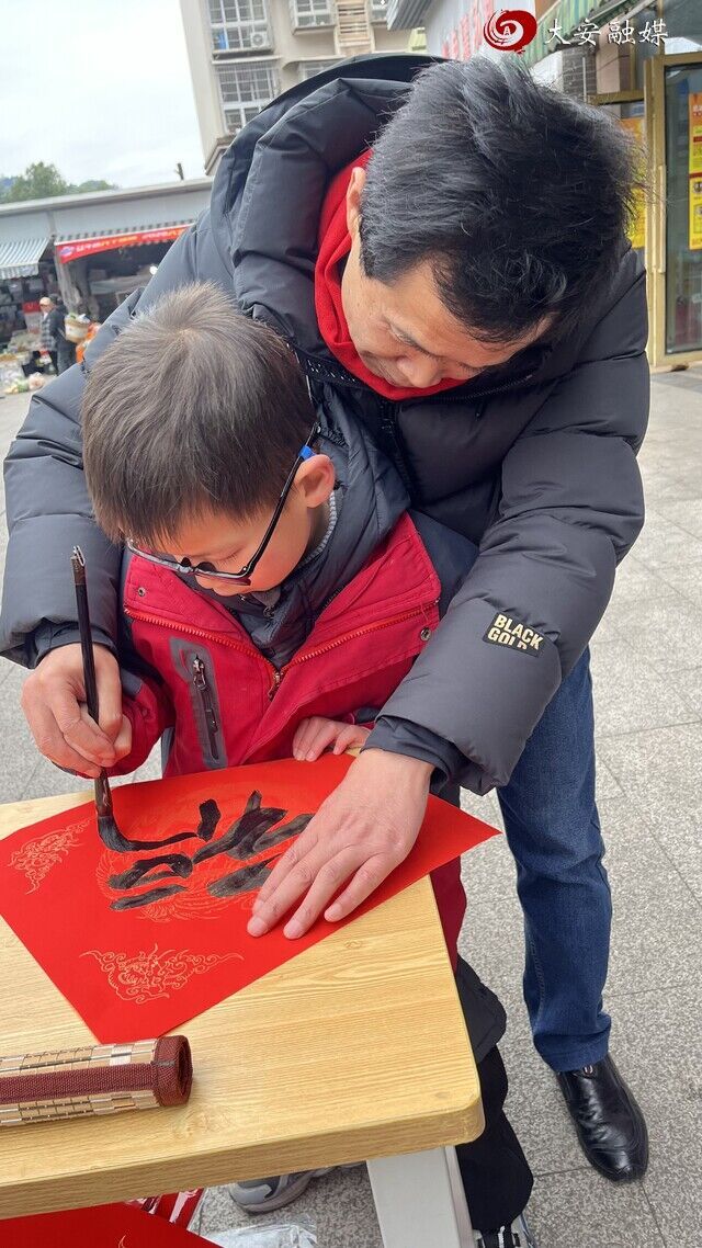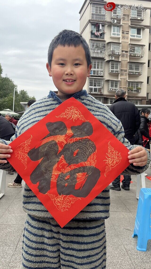 除了春联,形态各异的“福”字也备受青睐。书法家们巧运匠心,圆润饱满的“福”、端庄典雅的“福”、灵动飘逸的“福”跃然纸上,传递着“福到万家”的美好愿景,浓厚的艺术氛围让孩子也忍不住参与其中,在书法家们手把手的指导下也感受到了汉字书法之美,孩子们手捧墨迹未干的春联和“福”字,脸上绽放着笑容,现场气氛热烈而温馨。