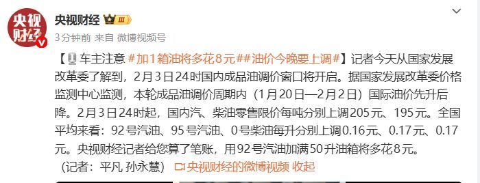记者今天从国家发展改革委了解到,2月3日24时国内成品油调价窗口将开启。据国家发展改革委价格监测中心监测,本轮成品油调价周期内(1月20日—2月2日)国际油价先升后降。2月3日24时起,国内汽、柴油零售限价每吨分别上调205元、195元。全国平均来看:92号汽油、95号汽油、0号柴油每升分别上调0.16元、0.17元、0.17元。央视财经记者给您算了笔账,用92号汽油加满50升油箱将多花8元。