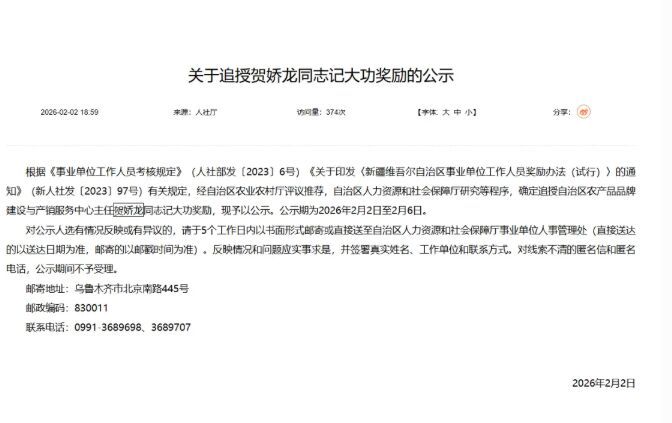 2月2日,新疆维吾尔自治区人社厅发布《关于追授贺娇龙同志记大功奖励的公示》。