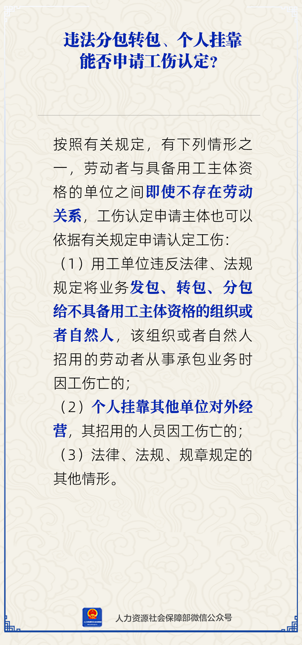 (1)用工单位违反法律、法规规定将业务发包、转包、分包给不具备用工主体资格的组织或者自然人,该组织或者自然人招用的劳动者从事承包业务时因工伤亡的;