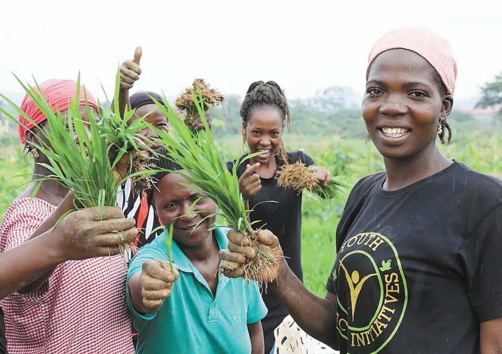 在位于阿布贾的中国援尼日利亚农业技术示范中心,当地员工展示秧苗。新华社记者 董江辉摄