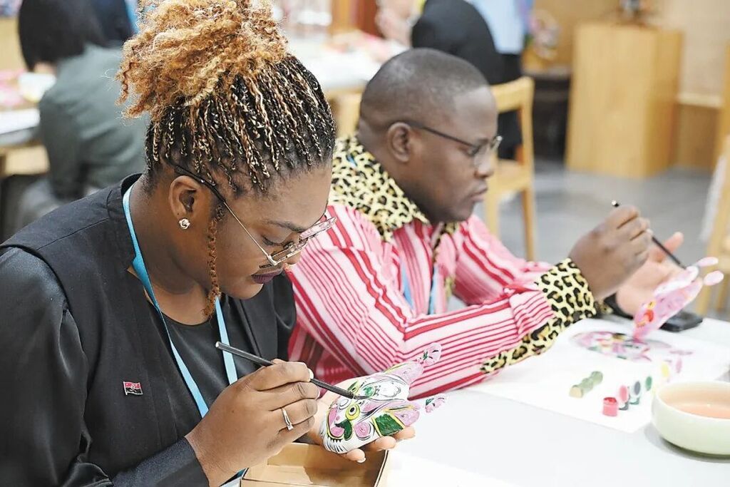 2024年5月20日,参加第八届中非青年大联欢活动的非洲青年代表在北京的中国宋庆龄青少年科技文化交流中心体验泥塑彩绘。田雨昊摄(影像中国)