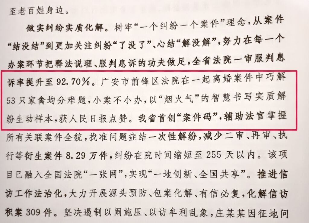 记者发现,广安“吃鸡离婚案”被写入省法院工作报告。报告提到,“广安市前锋区法院在一起离婚案件中巧解53只家禽均分难题,小案不小办,以‘烟火气’的智慧书写实质解纷生动样本。”