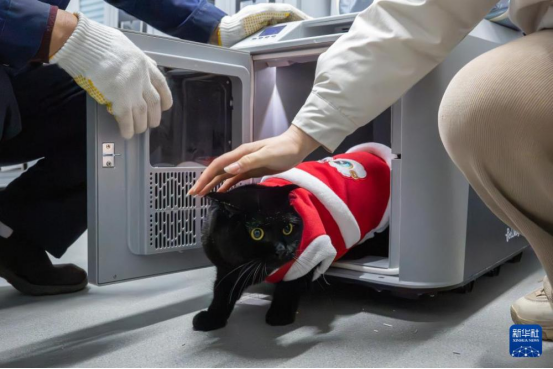 2月3日,在湖北武汉火车站,一只小猫从“高铁宠物运输智能箱”内探出身体,被主人接走。随着春运大幕开启,武汉火车站迎来一些“萌宠”旅客。这些符合条件的宠物与主人搭乘同趟高铁列车,人宠同车出发、同时抵达。