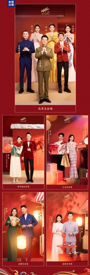 2月4日,中央广播电视总台《2026年春节联欢晚会》发布主持人阵容。任鲁豫、撒贝宁、尼格买提、龙洋、马凡舒、刘心悦将共同担任2026年总台春晚北京主会场主持人。四地分会场主持人为:黑龙江哈尔滨分会场杨帆、姜多;浙江义乌分会场郭若天、贺传;安徽合肥分会场朱迅、白羽;四川宜宾分会场张韬、王楚涵。