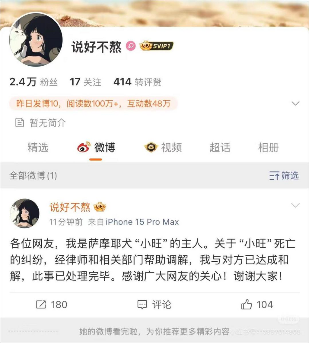 ·被烧死萨摩耶主人发文称已与对方达成和解,并删除此前所有内容。