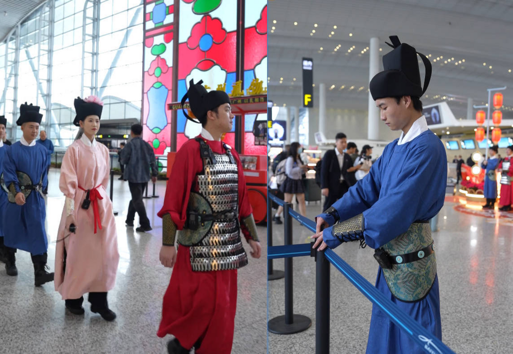 ·广州白云机场“宋服卫士”“唐装护卫”火出圈,工作人员:他们还会说“客官这边请”。