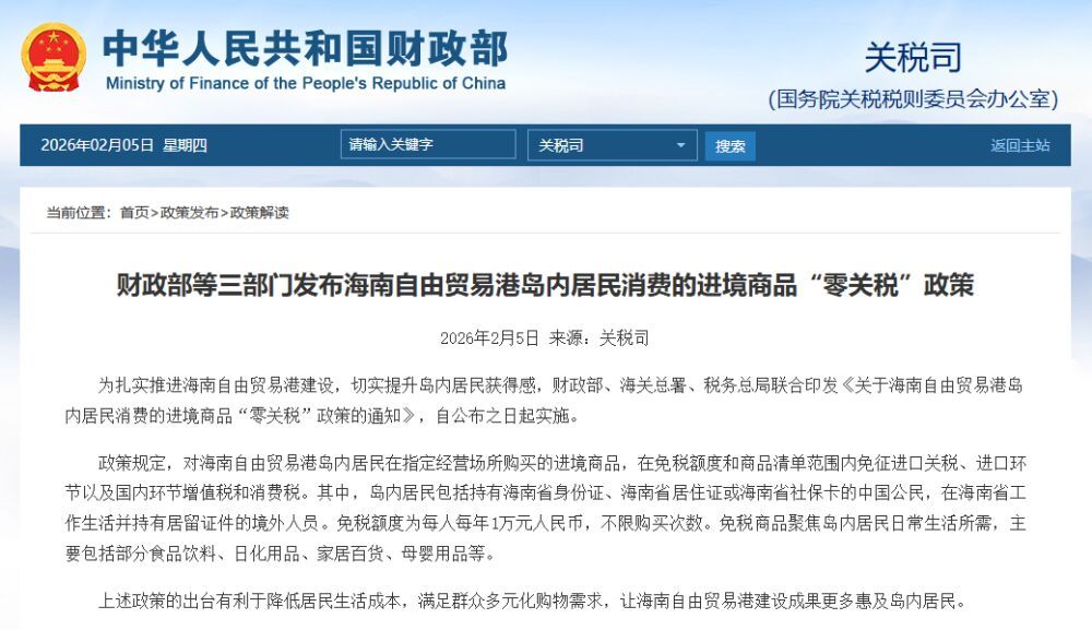为扎实推进海南自由贸易港建设,切实提升岛内居民获得感,财政部、海关总署、税务总局联合印发《关于海南自由贸易港岛内居民消费的进境商品“零关税”政策的通知》,自公布之日起实施。
