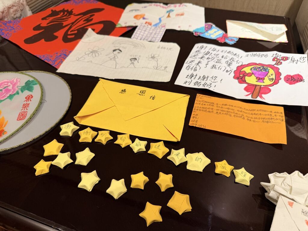 “这是村里留守儿童们写的信件。”刘春香从包里翻出一沓信件,上面用稚嫩的笔迹写着对“刘妈妈”的感谢,并配上了卡通图画。