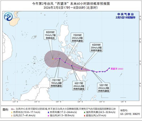 央视网消息:据中央气象台消息,今年第2号台风“西望洋”(热带风暴级)的中心今天(2月5日)下午5点钟位于菲律宾马尼拉东南方向约1020公里的洋面上,就是北纬8.2度、东经127.7度,中心附近最大风力有8级(20米/秒),中心最低气压为995百帕,七级风圈半径为180-320公里。