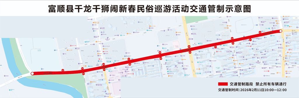为确保“千龙千狮闹新春 欢欢喜喜过大年”民俗巡游活动顺利举办,保障巡游道路安全,结合本次文化活动规模、周边道路通行条件,根据《中华人民共和国道路交通安全法》等法律法规规定,富顺县公安局决定对部分道路实施临时交通管制,现将有关事项通告如下: