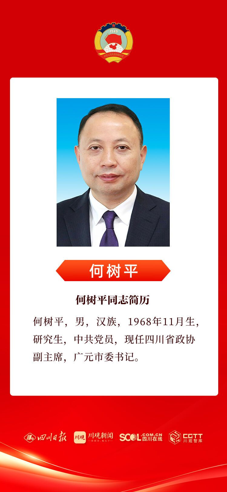 2月6日,政协四川省第十三届委员会第四次会议举行第三次全体会议。何树平当选为政协四川省第十三届委员会副主席。