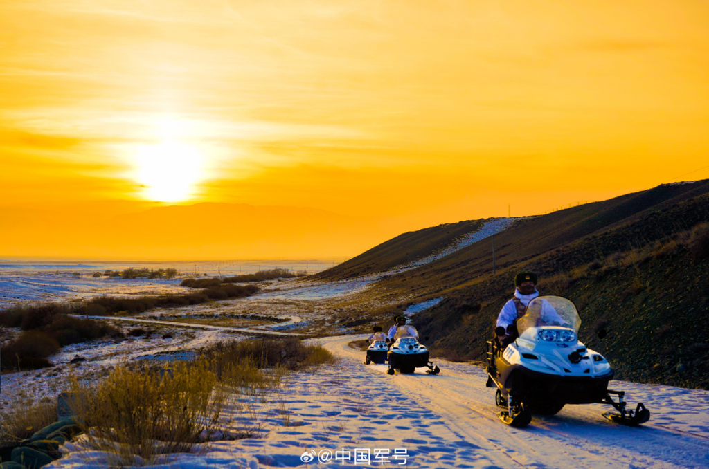 近日,新疆军区某边防团小白杨哨所官兵驾驶摩托雪橇执勤巡逻,守护边境安全稳定。